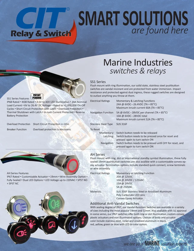 Relays and switches are fundamental components in the marine industry; used extensively for controlling and protecting electrical circuits and systems on boats, yachts, ships and other marine vessels and dockside components. Applications include engine control systems, lighting systems, alarm and safety systems, navigation and communication systems, control panels, bilge pumps, and entertainment systems along with many peripheral components both on-board and on shore.