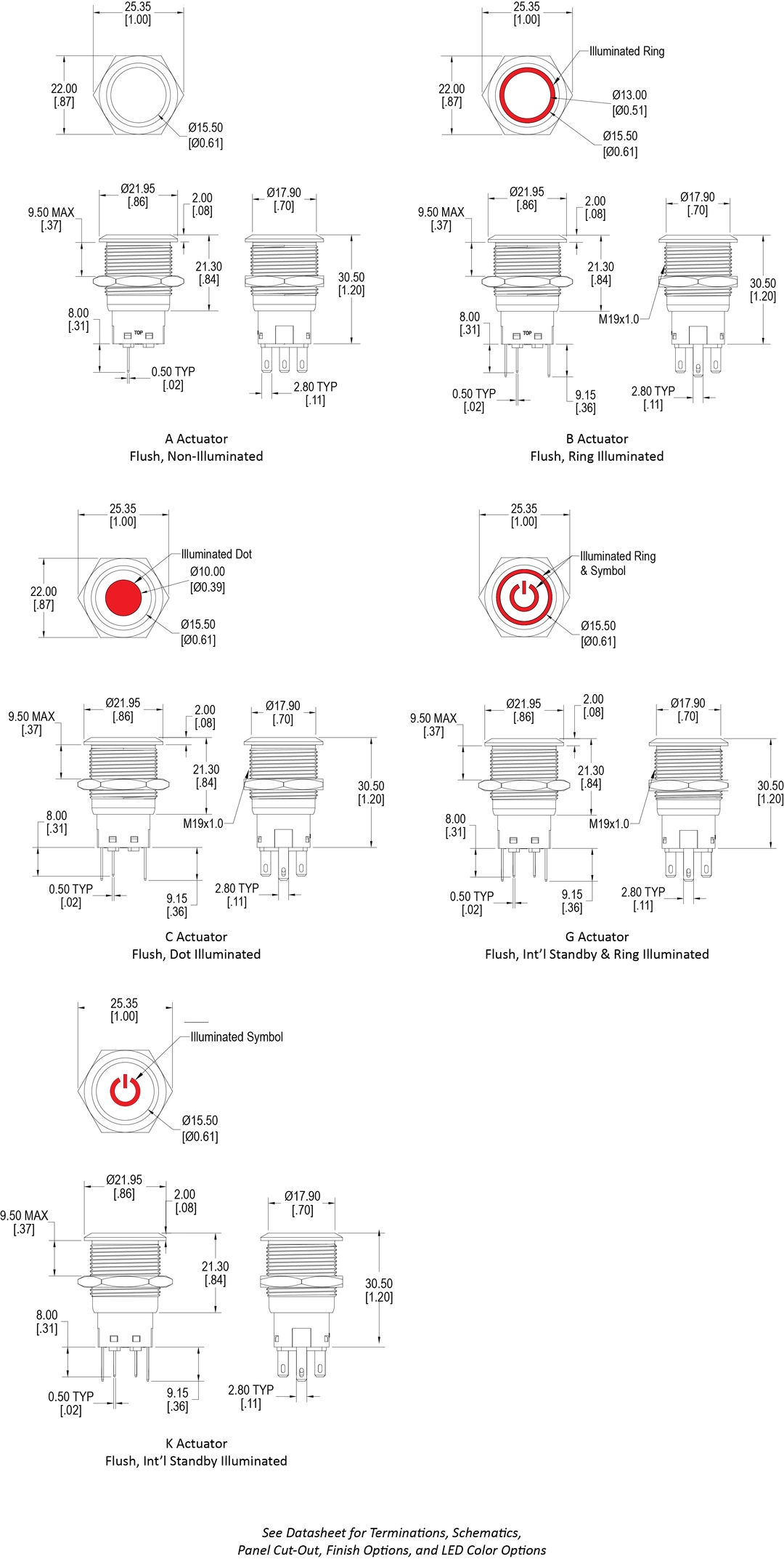 Momentary or latching in function, the AHB Series is 19mm in size and is available with a choice of SPDT or DPDT. The flush actuator offers non-illuminated, bi-color ring, dot or international standby symbol illumination, with illumination color choices of red, yellow, green, blue, white and orange with dual color options and RGB too. Newly available is a customizable Epoxy Convex actuator – Contact Factory for details.