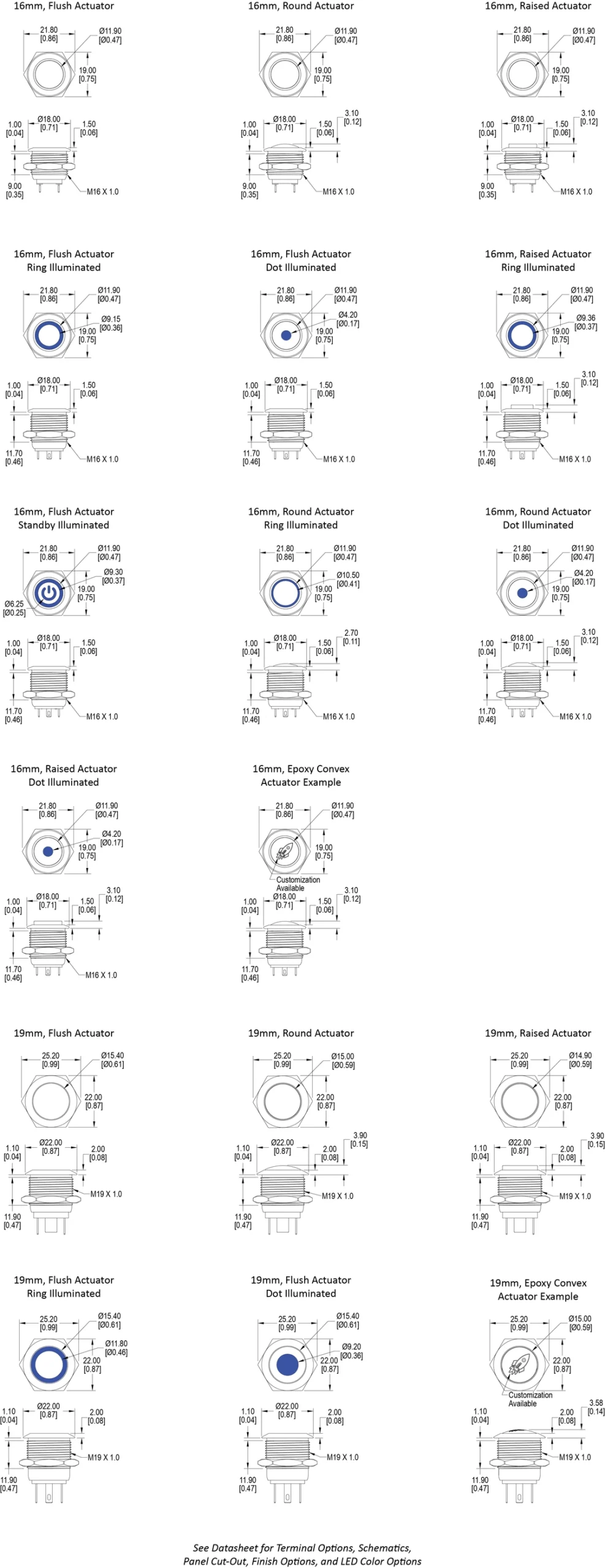 Vandal Proof, IP67 Sealing Degree, Center Dot or Ring Illumination, 16mm & 19mm, Panel Mount, Customizable Epoxy Convex Actuator