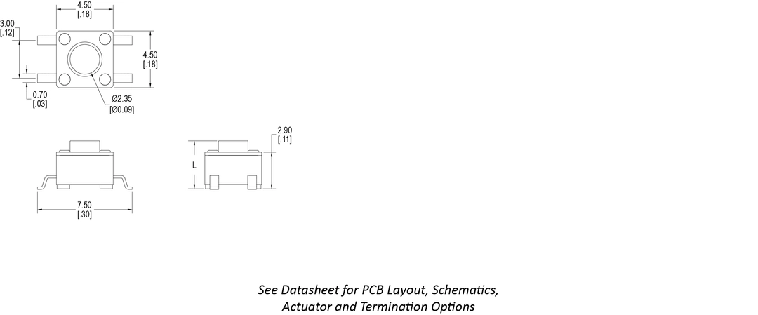 The CS1104 Series tactile switch is SPST momentary with a 4.5mm square body. Offering gull wing termination and an actuator length of 3.8mm, the CS1104 has a choice of 180gF or 260gF actuation force. Actuation travel is 0.25mm.