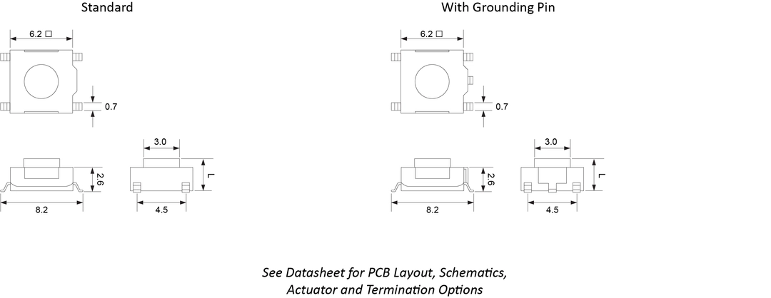 With a 6.2mm square body, the surface mount CS1109 tactile switch is available with a grounding pin option. Multiple actuator lengths range from 2.6mm up to 3.1mm. Actuation force is 160gF with .25mm actuator travel.