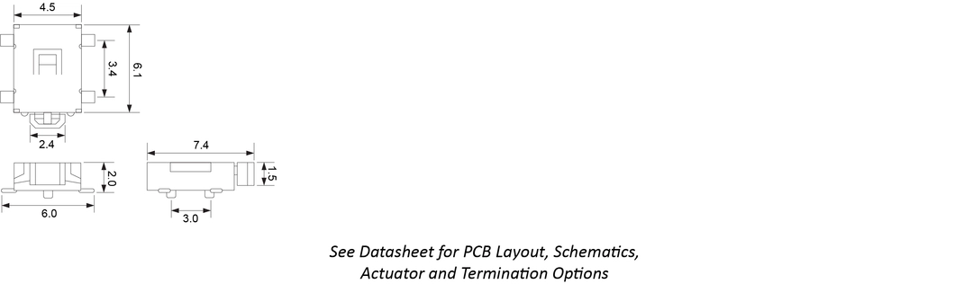 Small in size, the CS1206 is right angle and surface mount, SPST and momentary. Actuation force is 200gF with travel of .30mm. The body size is 4.5mm x 6.1mm with gull wing termination.