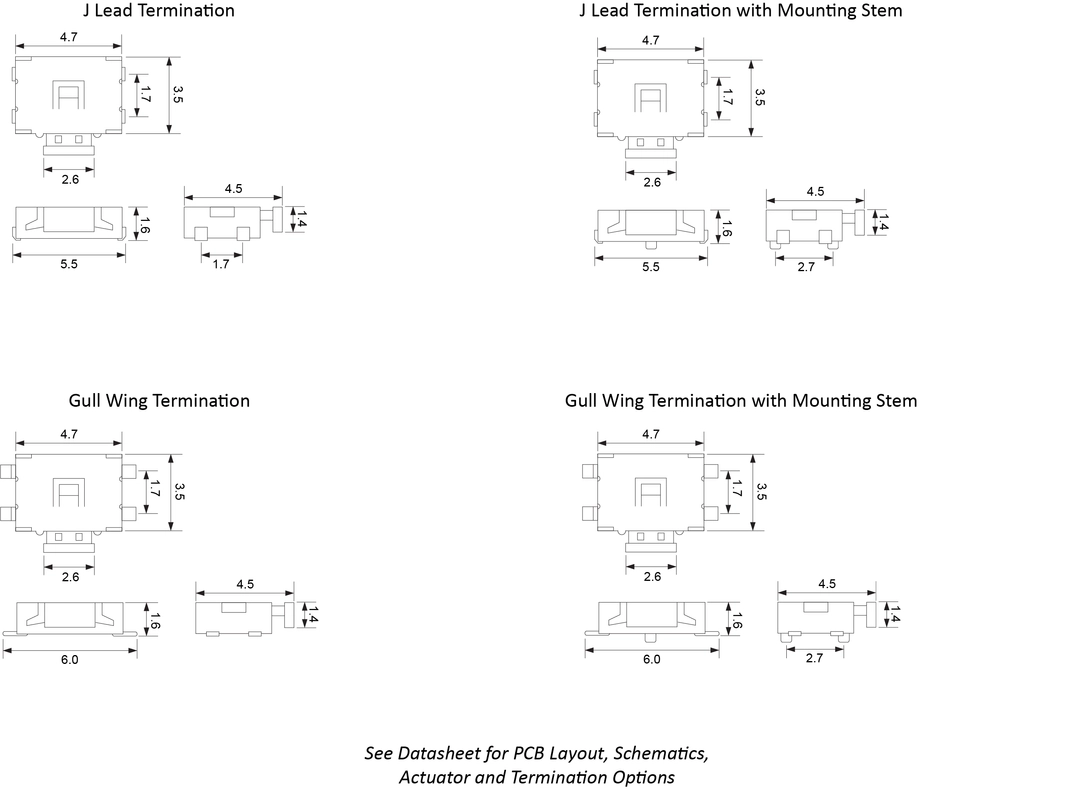 Right Angle, Surface Mount, J-Lead or Gull Wing Option, Mounting Stem Options, Multiple Actuation Force Options