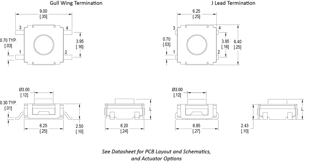 Surface Mount, Actuator Length Options, Gull Wing or J-Lead Terminal Options