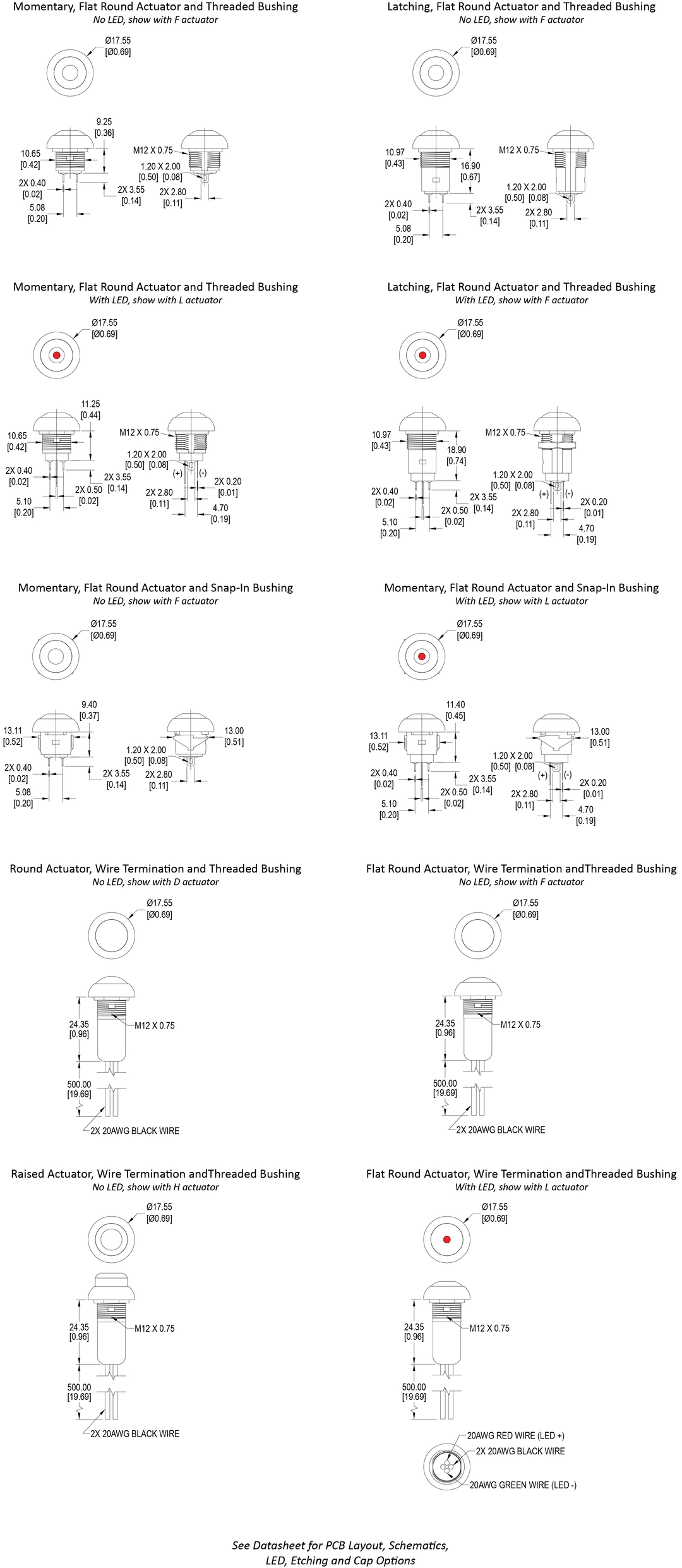 Bi-Color LED Option, Matte Finish, Round, Round with Flat, Round with Flat and LED, Square or Raised Actuator Options with, Wire Assembly Option, IP67 Sealing Degree Standard