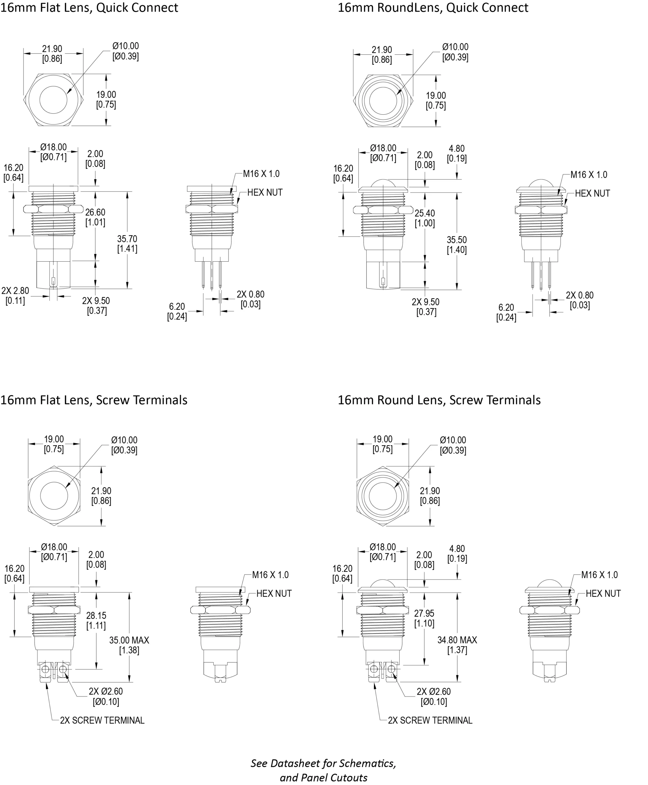 16mm; Flush or Rounded Lens; Marine Grade Brushed Stainless Steel, Brushed Stainless Steel or Black Anodized Aluminum
