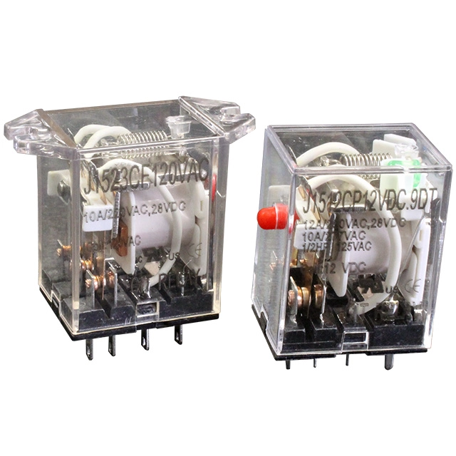 The J152 Series is an ice cube style relay with switching capacity up to 10A. With low coil power consumption and high contact load, the J152 Series has strong resistance to shock and vibration. Contact arrangements include 2C, 3C, and 4C. Coil voltage ranges from 12VDC up to 220VAC with DC coil power of .90W and AC coil power of 1.2VA. The J152 offers PC pin or solder lug mounting options. Dimensions are dependent upon style choice with a flange option. UL Agency approval is E197851.