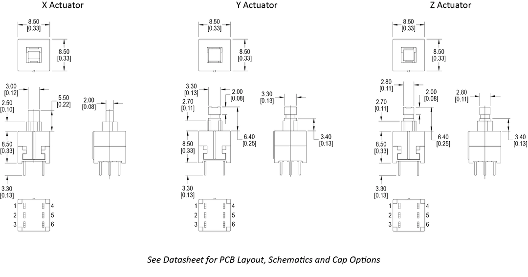 Miniature Size, Latching or Non-Latching Option, Actuator Size Options, Straight or Bent PC Pin Termination, Multiple Cap Options