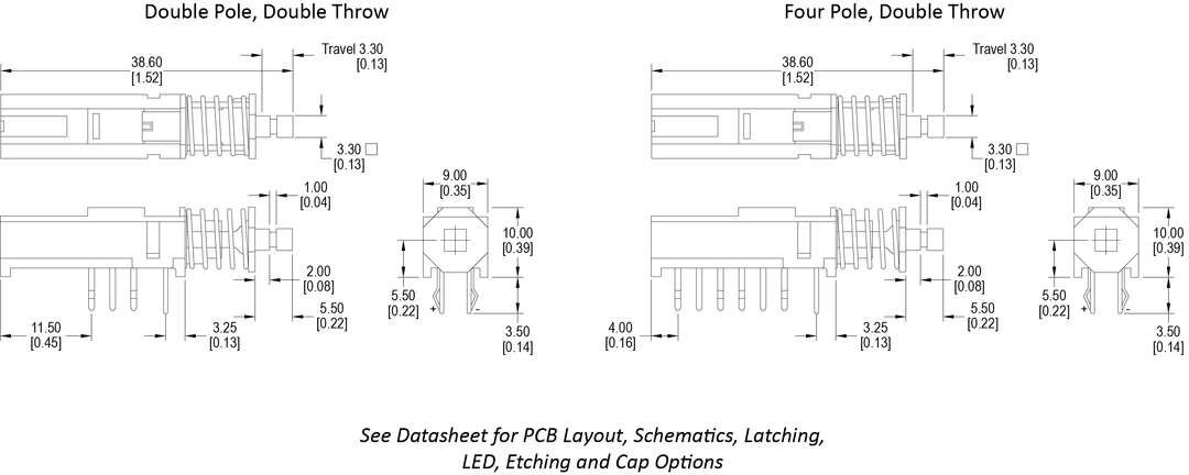 The illuminated horizontal pushbutton LPH Series is available with bi-color LED choices of red, green, yellow and blue. DPDT or 4PDT, the LPH offers both momentary and latching options. Actuation Force is 300gF. Cap options are clear or misty silver finish with ten laser etching choices.