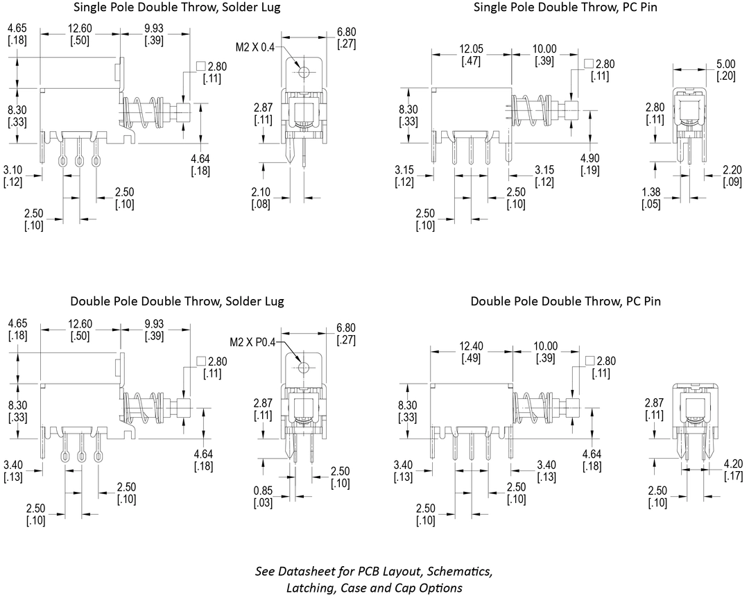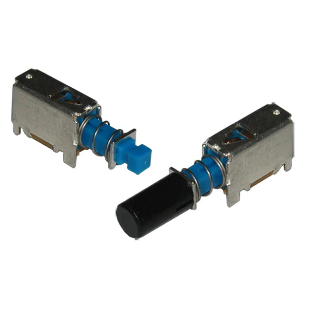 The horizontal pushbutton MP Series is SPDT or DPDT with a choice of solder lug or PC pin termination. Case style choices are PC pin case or threaded panel mount tab. Momentary or latching, the MP Series offers cap options in white, black, red, light gray or custom colors.