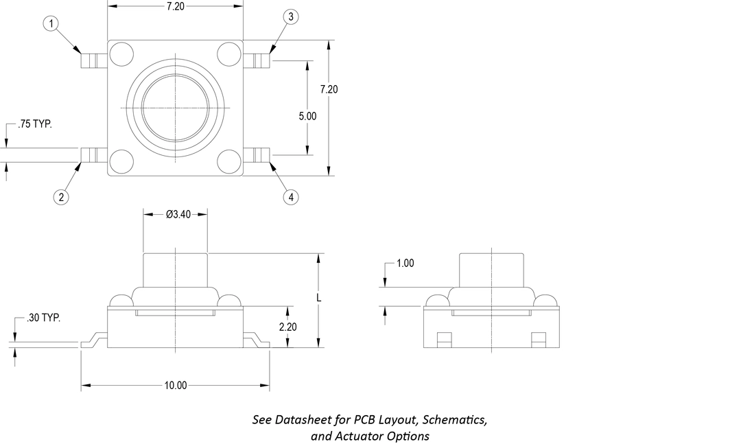 The STS Series tactile switch has surface mount gull wing termination with IP67 sealing degree. SPST and momentary, the STs offers actuation force choices of 200gF or 260gF. With a stainless steel contact dome, actuation travel is .45mm with actuator length choices of 4.3mm, 5.0mm or 7.0mm.